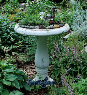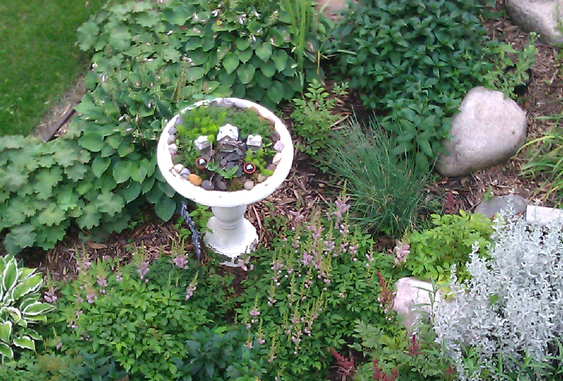 Then I hit upon the idea of using the cement birdbath that was always full of ishy smelly water and leaves…..no birds….obviously better for fairies.