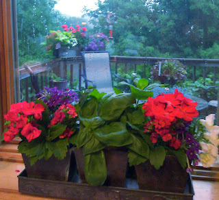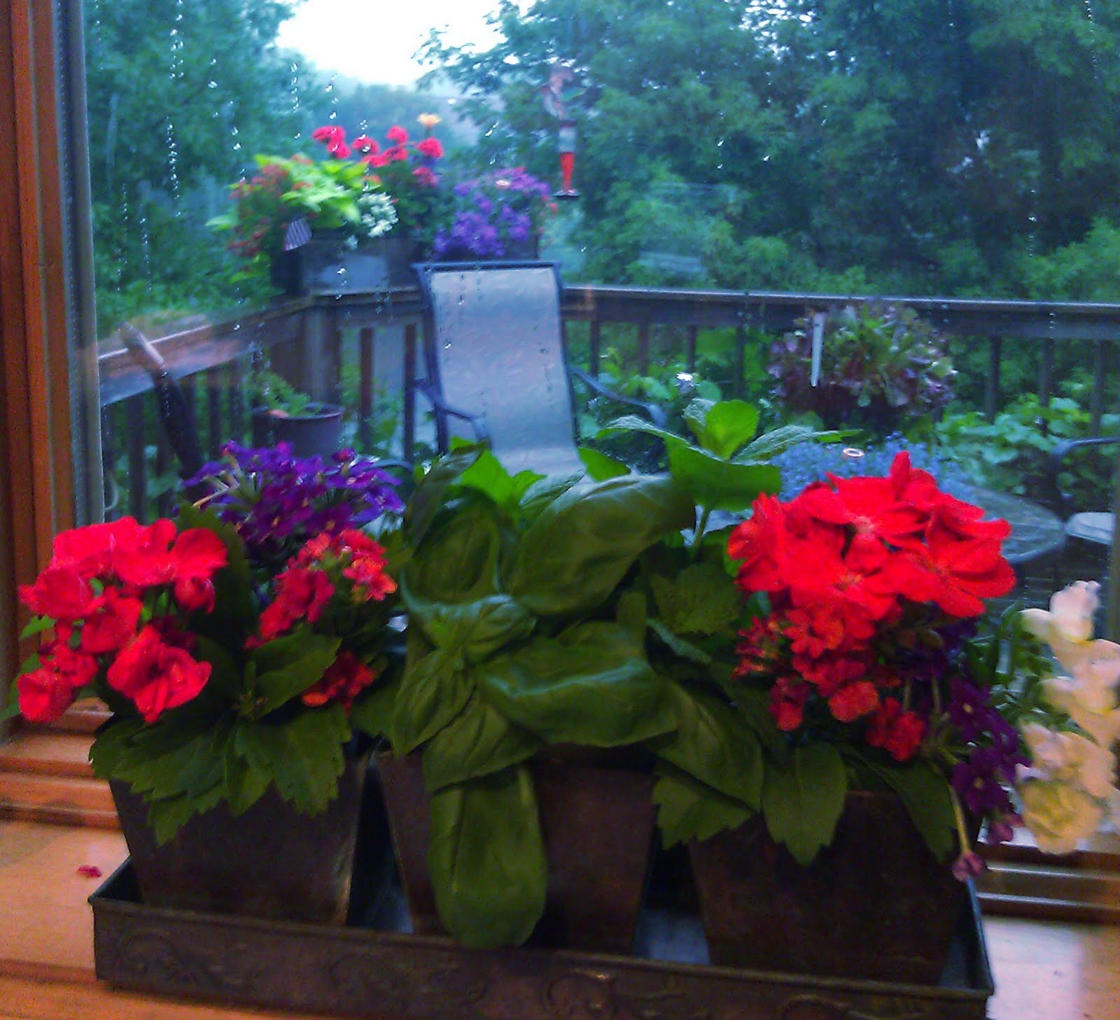 This arrangement over the kitchen sink was made from the flowers pinched back from the deck planters.