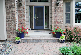 Instead of filling these big pots with dirt, we put  2 gallon pails upside down inside of the pots.  I left the geraniums in their hanging pots and set them on top of the pail and removed the hangers.  I stuck in some red dogwood twigs for height.