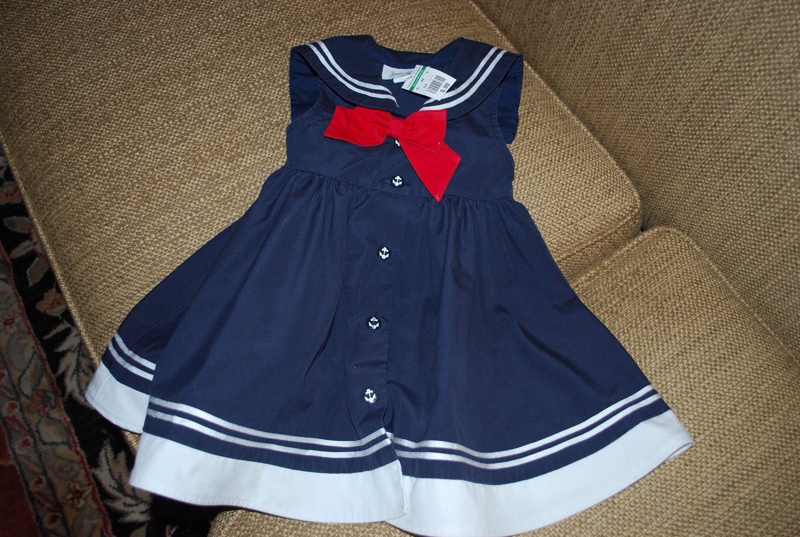 Look at this super cute sailor dress 99 cents-probably because there was a teeny red ink mark at the bottom of the white border. Bleach pen didn’t work-darn….what to do? I simply turned up 1/4 inch and top stitched the ink-mark (now pretty faded) into the back side of the hem. I sent off to Cecilia, my daughter’s law school partner’s little girl. Hope I get a picture of her wearing it!