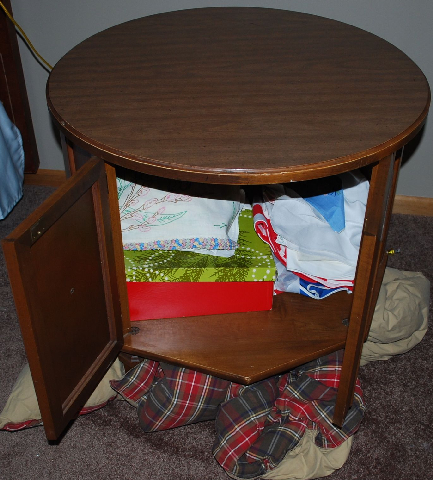 So if you don’t have a round table somewhere in your house….keep your eyes open at garage sales or thrift stores. You could hide one too!