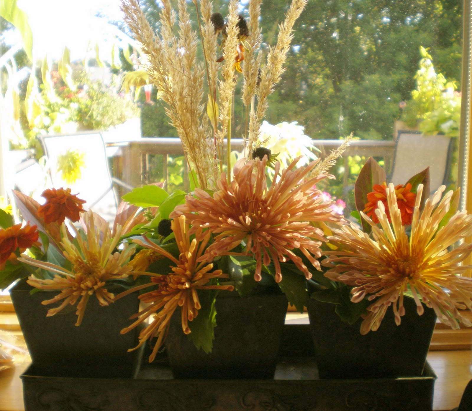 The 3 copper planters in the windowsill are filled with my favorite mum blooms, some orange marigolds and grasses.