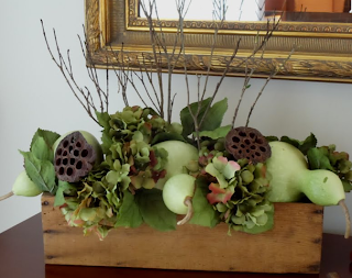 Babs at Upstairs Downstairs created this gorgeous combination using gourds, seedpods, a few hydrangeas and some twigs! |