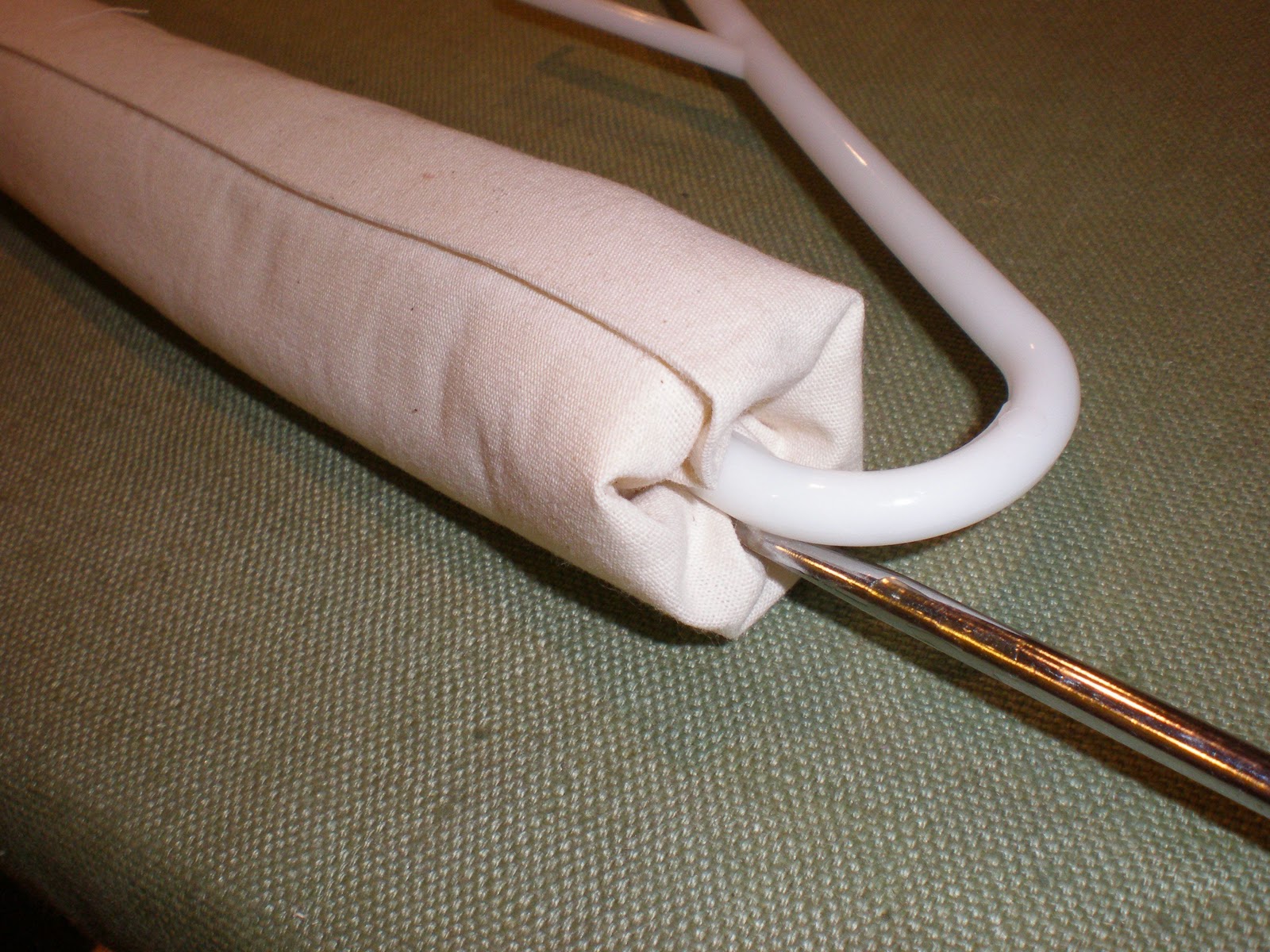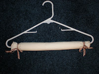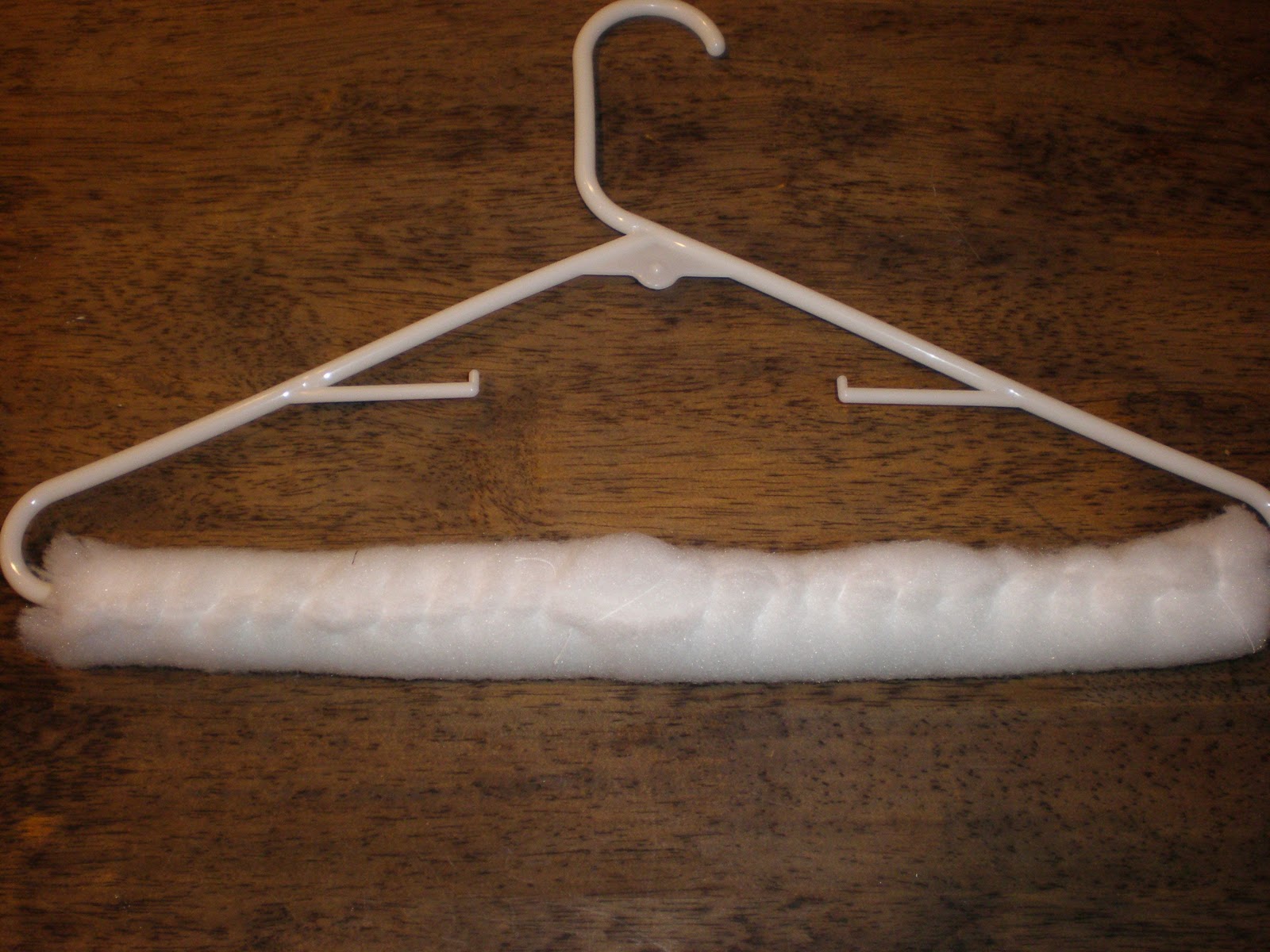 I came up with a solution using plastic hangers, quilt batting, fabric remnants and ribbon…….