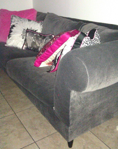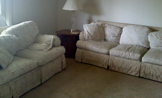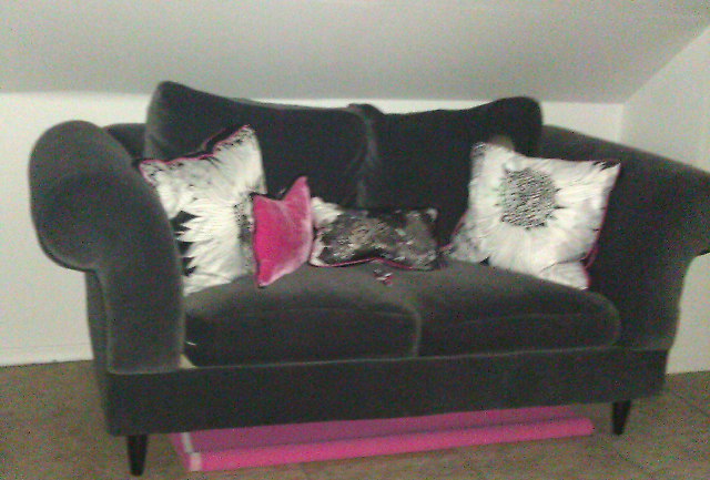 Me: Maybe you should just burn them! But what do you want for furniture up here?T: I want seating but something sort of modern and really comfy….I love these pink and gray pillows from Target and like the idea of grays and pink.Me: So would you still have a couch and the love seat?T: Yeah….but it will be a long time before that is in the budget…Maybe Craig’s List?Me: What if we tried to recover these?T: I HATE THEM! Look at the skirts….they are just awful!Me: Let’s go rip off the skirts and see what they look like!