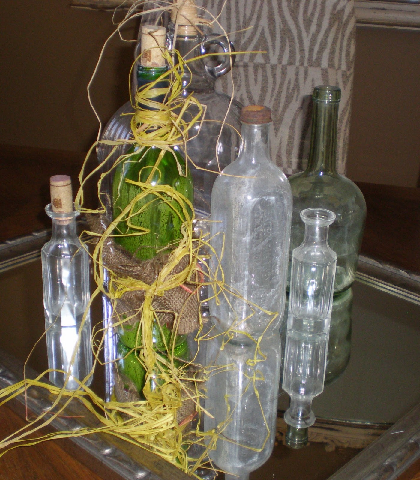 The dining room table gets a centerpiece of some old bottles on a goodwill mirror…..