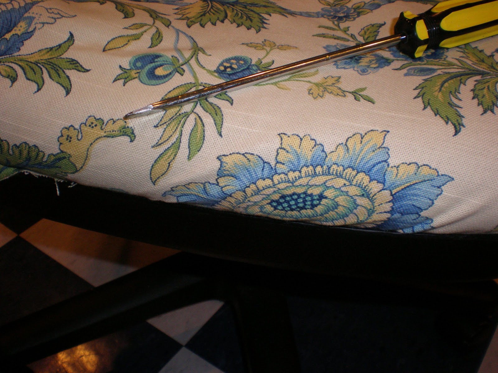 The construction of the chair is such that all I needed to do was get my trusty screwdriver out and push the fabric in around the frame!