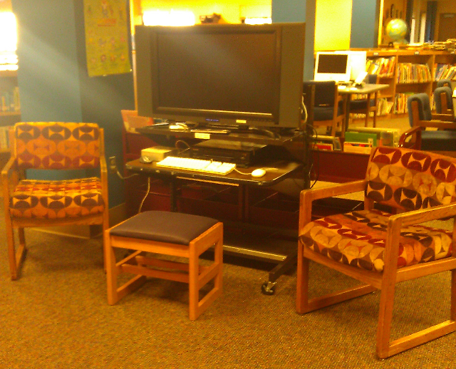 Notice the color wave on the library desk in the background….with the circles of purple and the orange and gold wave…..truly a match!