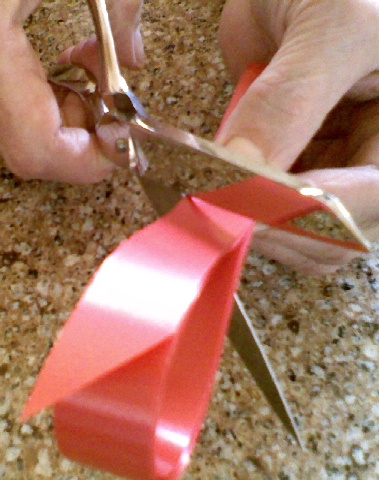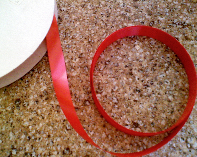 Cut a narrow piece of ribbon about 8 inches long….do this by splitting a piece of ribbon in half….
