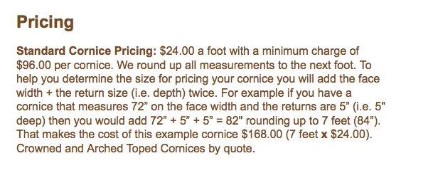 Just for a giggle look at these screen shots from websites where you can enter your window dimensions and order a custom cornice!