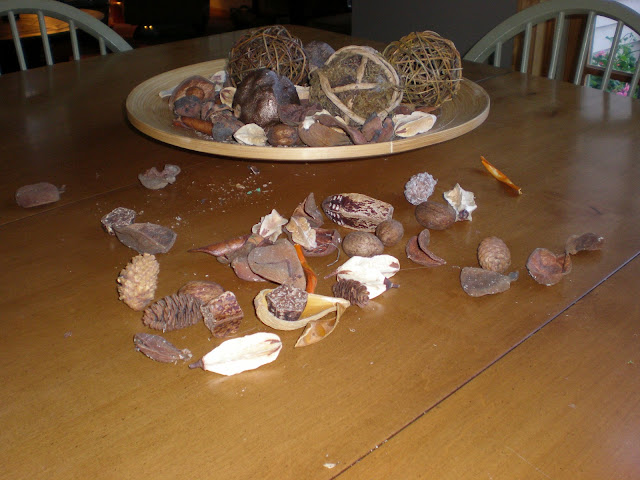 I put this planter with artificial leaves and cattails on the mantel along with a fall themed wreath….I think it will keep Mr. Marvin from jumping up there because there isn’t enough room for him to get a foothold….we shall see!