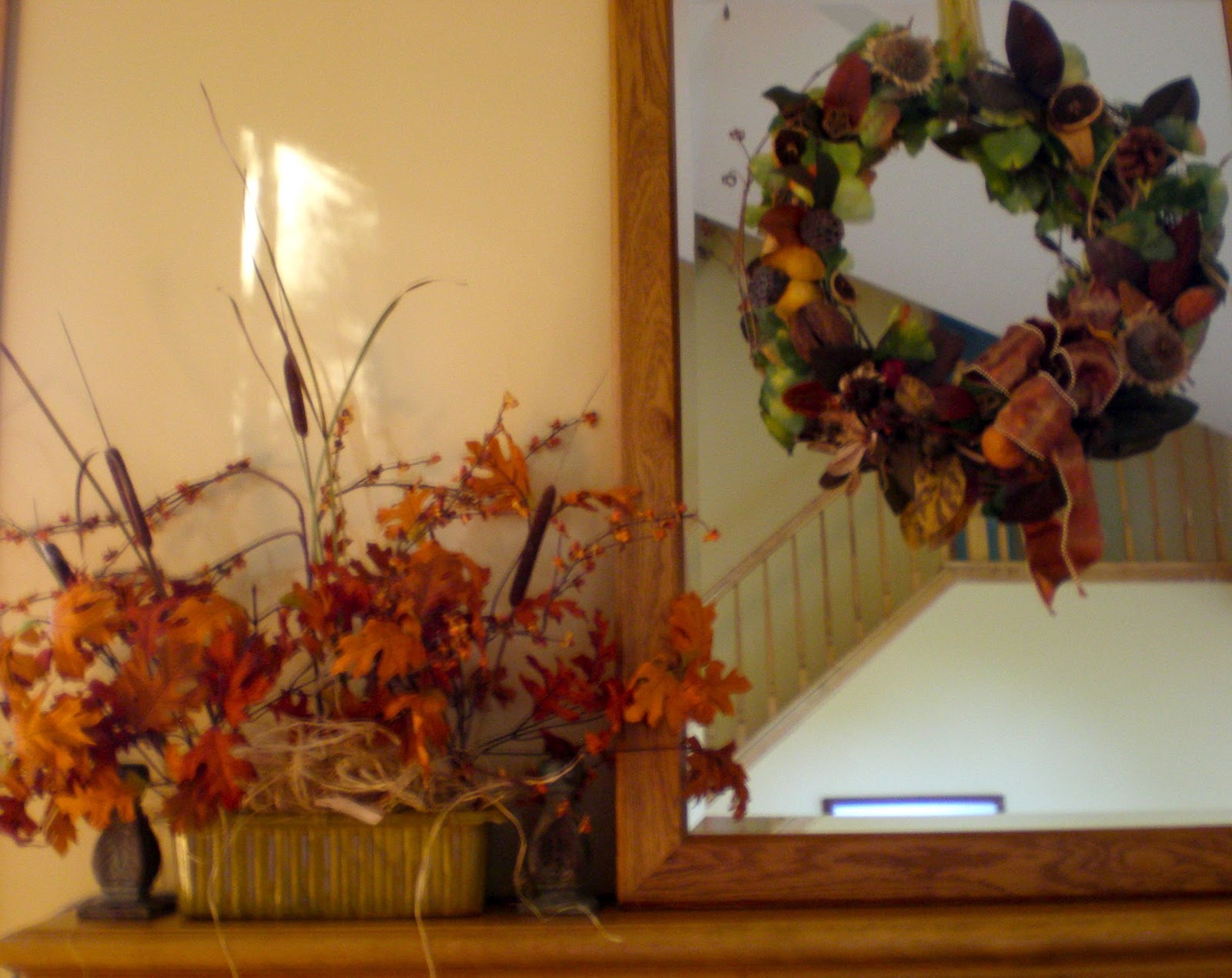I put this planter with artificial leaves and cattails on the mantel along with a fall themed wreath….I think it will keep Mr. Marvin from jumping up there because there isn’t enough room for him to get a foothold….we shall see!