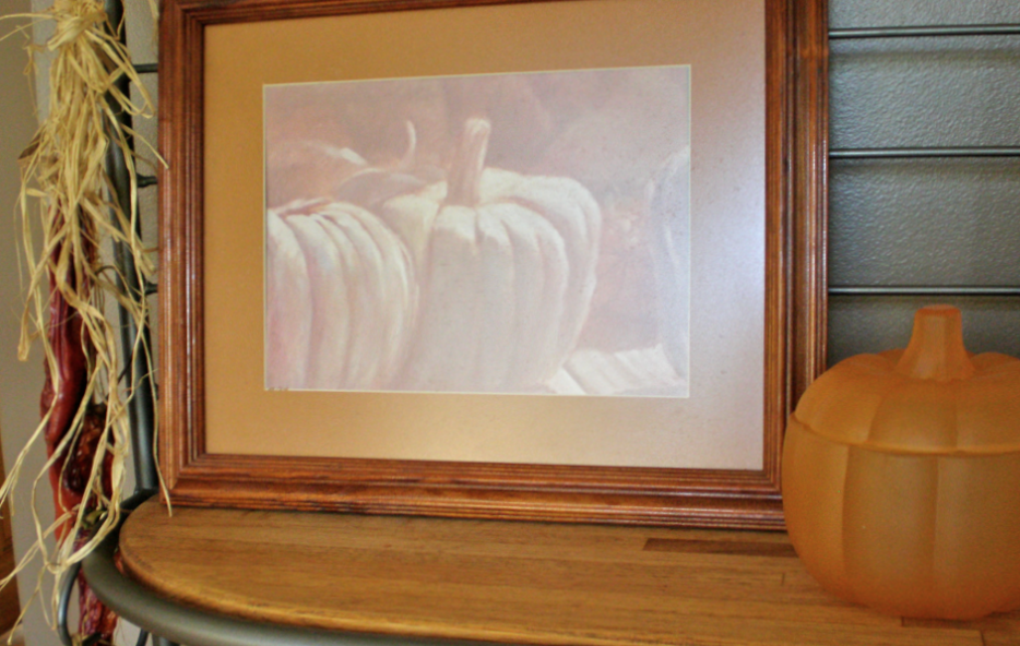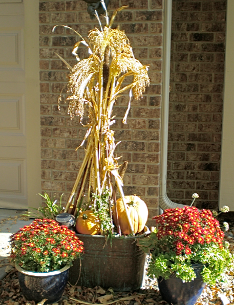 We picked up this bunch of weed stalks on our Saturday morning trip to the Farmer’s Market. I stuck them into the copper kettle and with the addition of a couple of artificial pumpkins and the 2 mum plants, it makes a nice simple accent in the front entry.