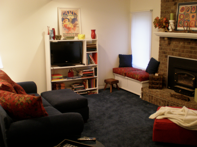 The blue summery fabric came off one of the ottomans….revealing more warm red….