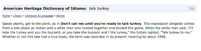 | “talk turkey.” The American Heritage® Dictionary of Idioms. Houghton Mifflin Company, 1992. Answers.com 10 Nov. 2012. http://www.answers.com/topic/talk-turkey |