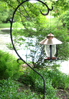 A copper bird feeder brings a bit of shine to the shady part of the garden….