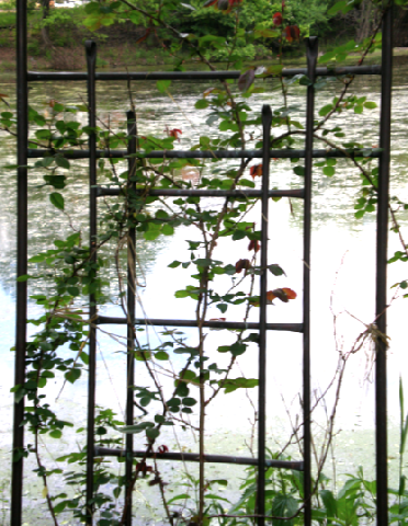 This copper trellis was a gift many years ago and now supports a climbing rose…
