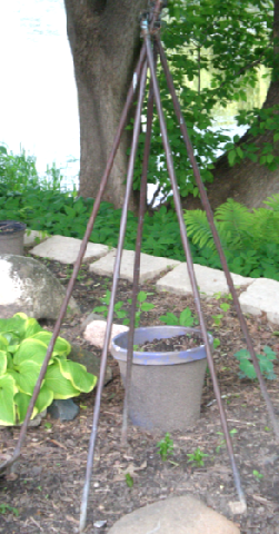 Here are 5 long stakes tied together at the top to make a support for climbing plants…