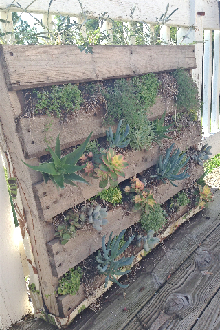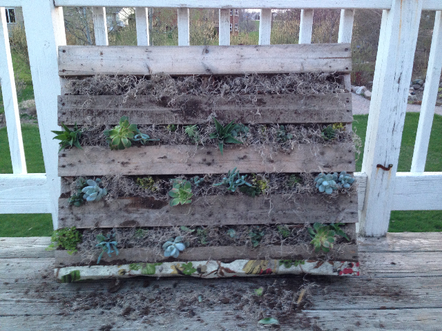 I have been bugging the Sweetwater Daughter to share her darling Pallet Garden planted with succulents….