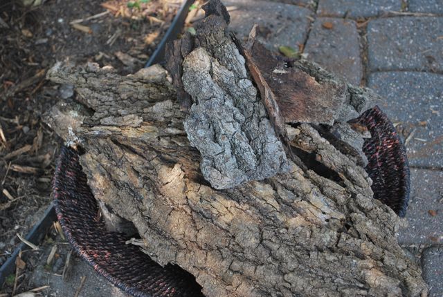 I could just attach some pieces of bark to a piece of log that was split to have a peak…