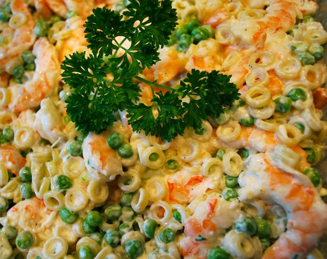 Just by adding some pasta and frozen peas…..you can double or even triple the size of the salad without losing any of the yummy goodness of the shrimp!