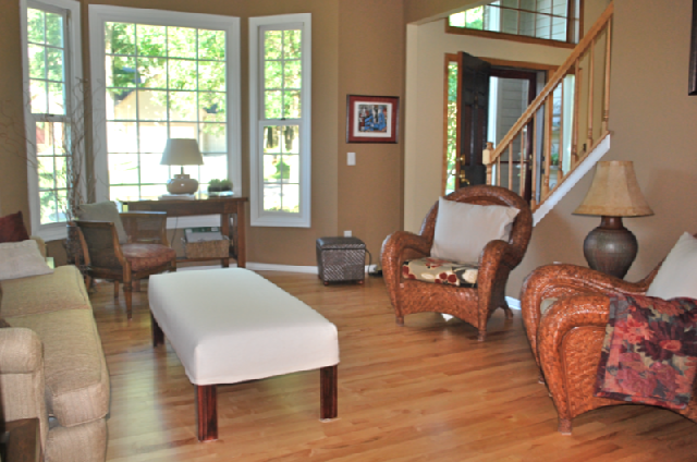 Mr. S was out mowing the lawn….and in the time that took….the Sweetwater Daughter and I had rolled up the patterned rug….switched out some of the patterned pillows…..figured out a way to lighten up the coffee table ottoman and seriously streamlined the patterns in the room! We also moved the printed fabric art and replaced it with a more contempory print!