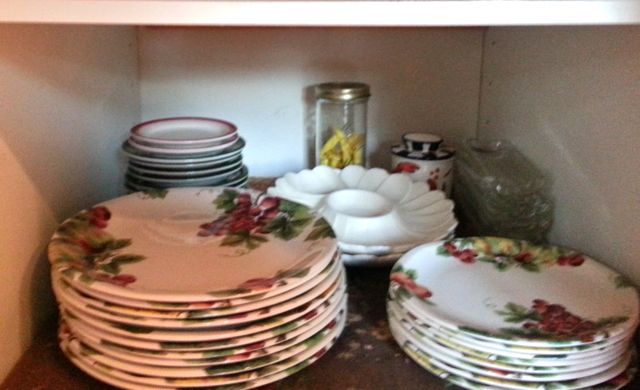 The next shelf has our everyday china set…..the corn dishes….a big stack of dessert plates and my treasured artichoke plates…close at hand!