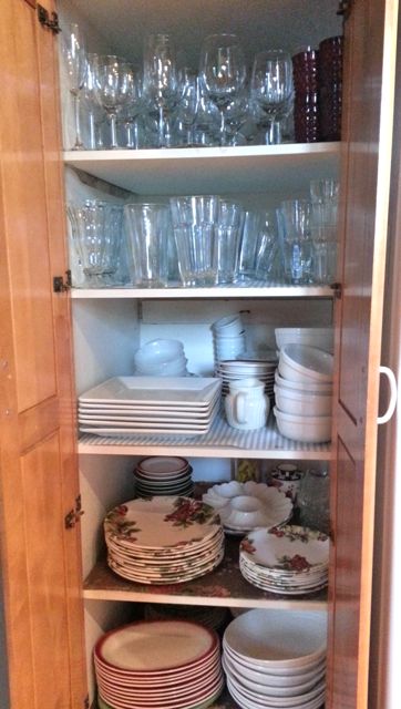 The second shelf has water glasses….and when I pay attention…I even organize them by style…but mostly….not! But they are all there when it is time to set the table!