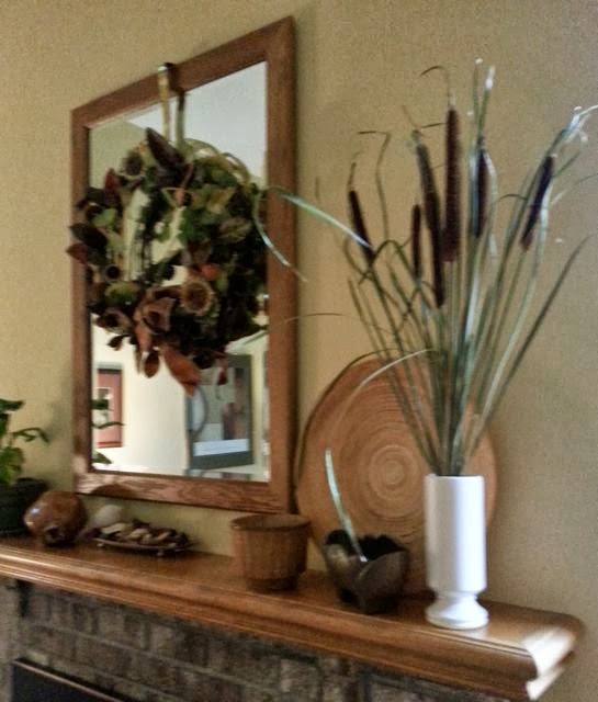 I have been “putting Summer away” around here. The nautical mantel has morphed into it’s Autumn look.