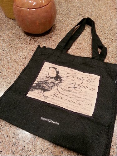 I had this black tote bag with an ugly advertising image on it…..with the same ribbon trim….the “less than perfect” raven print became….the perfect little birthday gift for a literature loving friend!