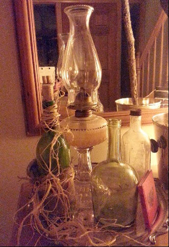 This arrangement of old bottles on a silver tray or mirror is a simple touch….
