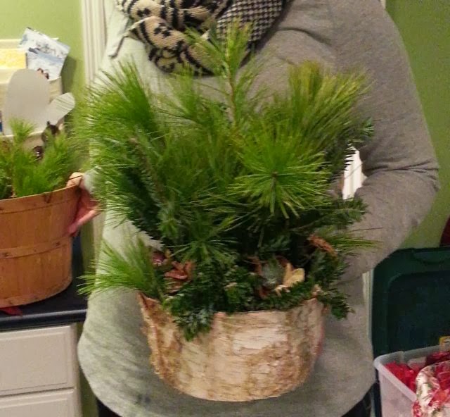 Greens, long birch logs, red dogwood and another bright bow!