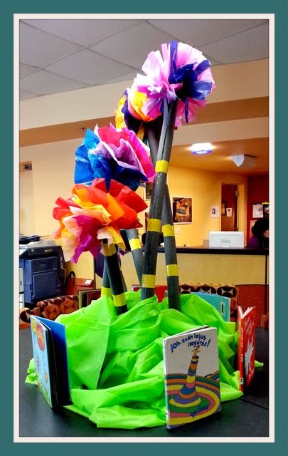 I had fun making these Truffula Trees….with a little help from a High School Volunteer….we whipped them up using pipe insulation….duct tape….and tissue paper! I think The LORAX would be proud!