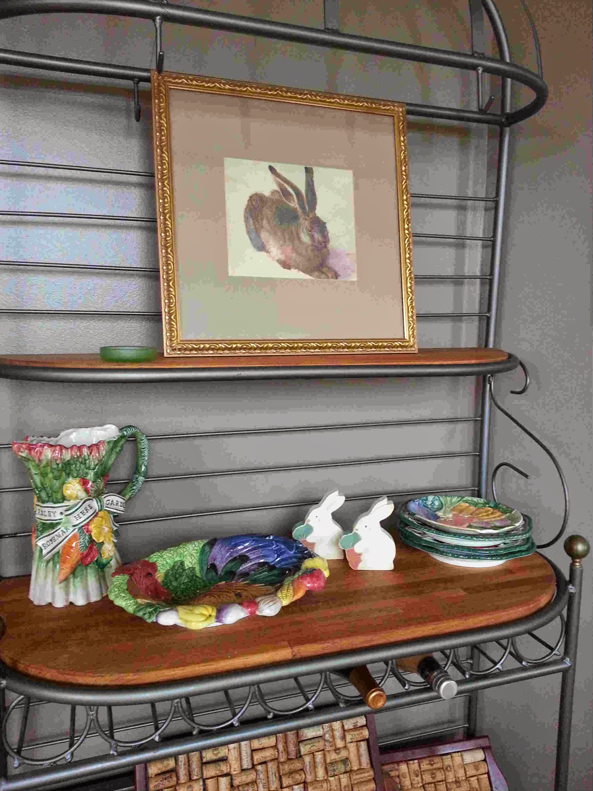 The Baker’s Rack really needs some more work….but I have the Fitz and Floyd Easter stuff and the Bunny print out…..so it will do for now!