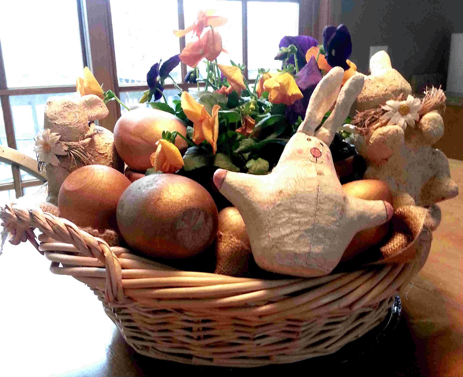 This basket of pansies can’t go outdoors quite yet…so with a few wooden eggs and a couple of bunnies…..they make a bright bit of Easter on the table in the kitchen!