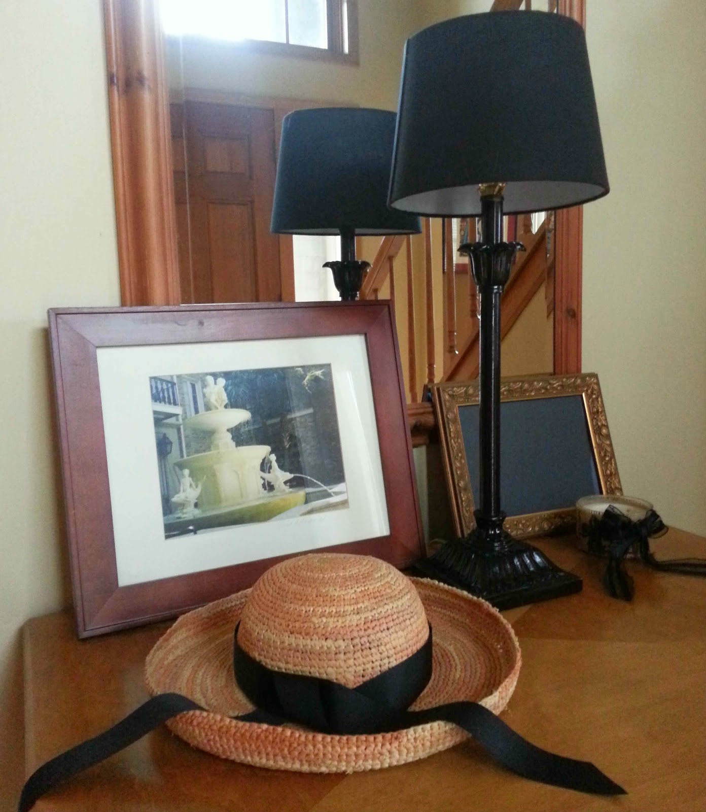 What is Easter without an Easter Bonnet?  So this little straw hat with a black gross grain ribbon makes a cute addition to the entryway table.