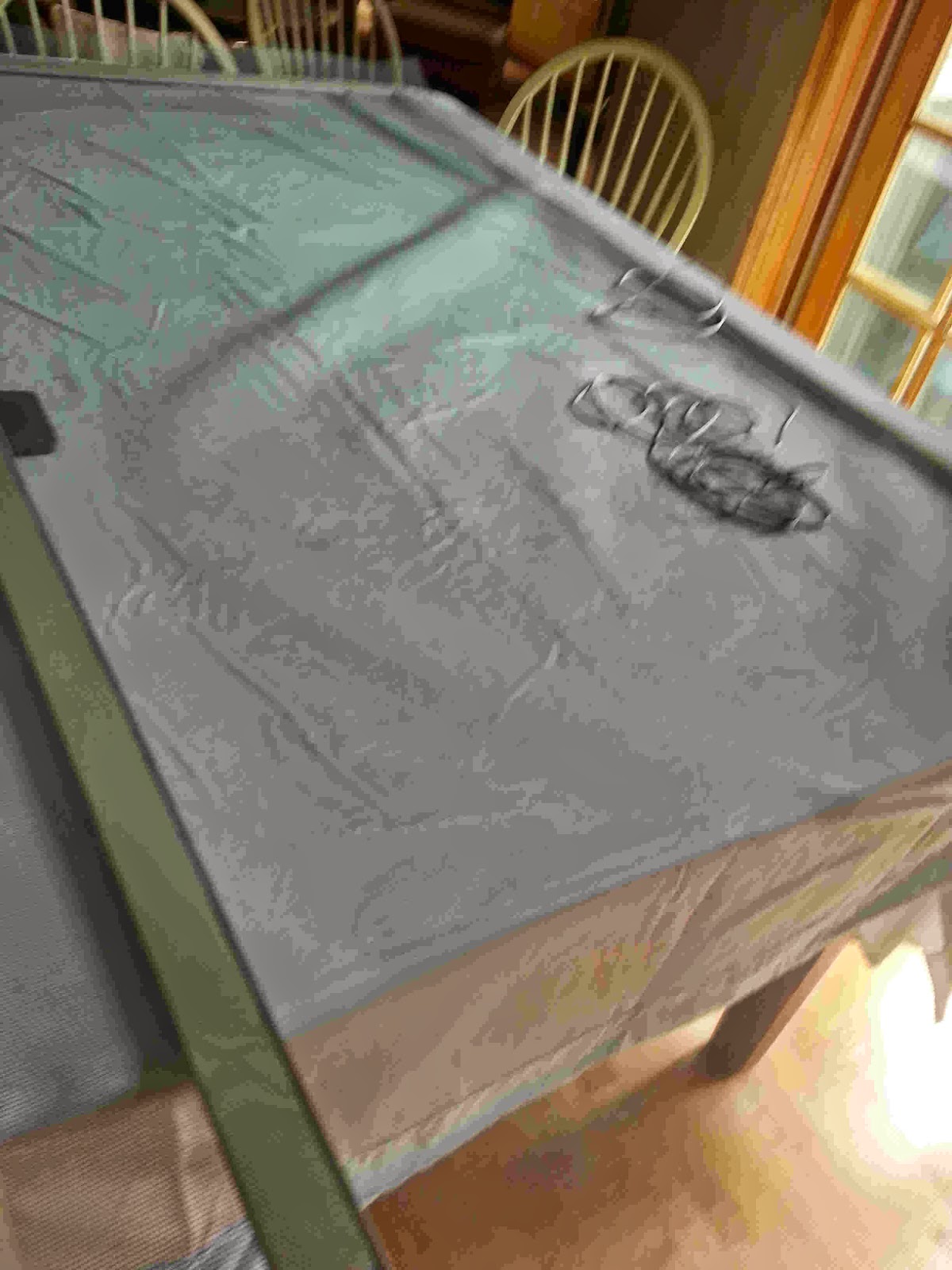 Since we didn’t want to crawl around on the floor, we covered the table with a sheet and put the screen on top.