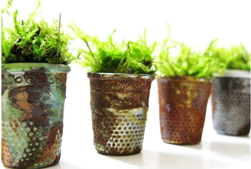 How simple to use an old thimble….the aged patina is a nice touch….and add a little moss to make Fairy Planters!
