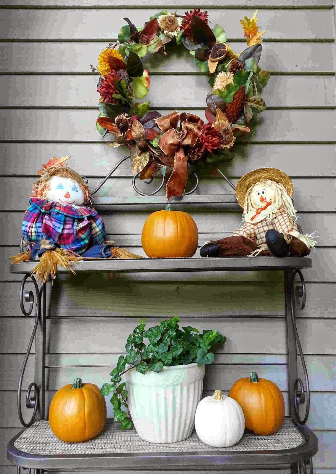 I also used some of the artificial pumpkins on the baker’s rack on the front steps….hopefully they are protected enough that they won’t blow away!