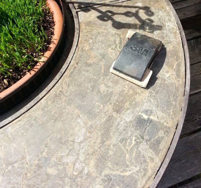 The easy fix was sort of a faux slate treatment achieved with a couple of passes with some bronze and black spray paint!