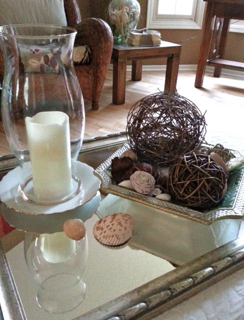 The Good Will mirror on the ottoman is a great display space. The bowl is a new Fitz and Floyd find from goodwill. It is filled with shells and potpourri. Bags of potpourri found at the thrift store are great buys. The “stuff” in them is always so interesting.