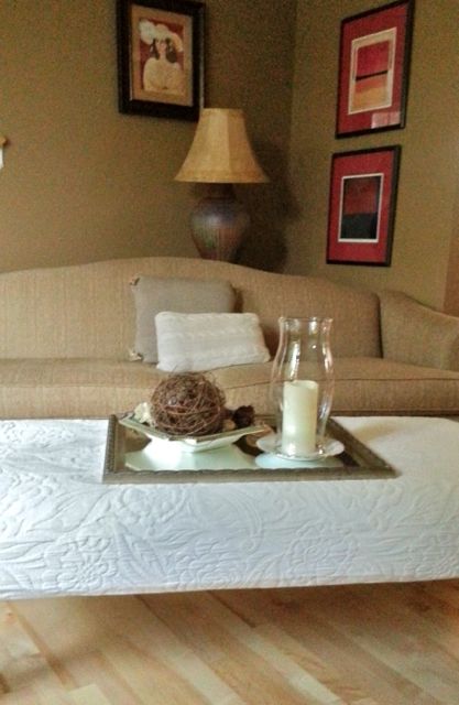 The ottoman in the living room is slipcovered with washable off-white damask fabric. It easily comes off for washing….so it is no problem to put your feet up and relax.
