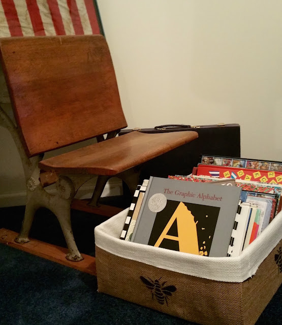 This burlap covered box sits in the lower level family room next to the old school desk.