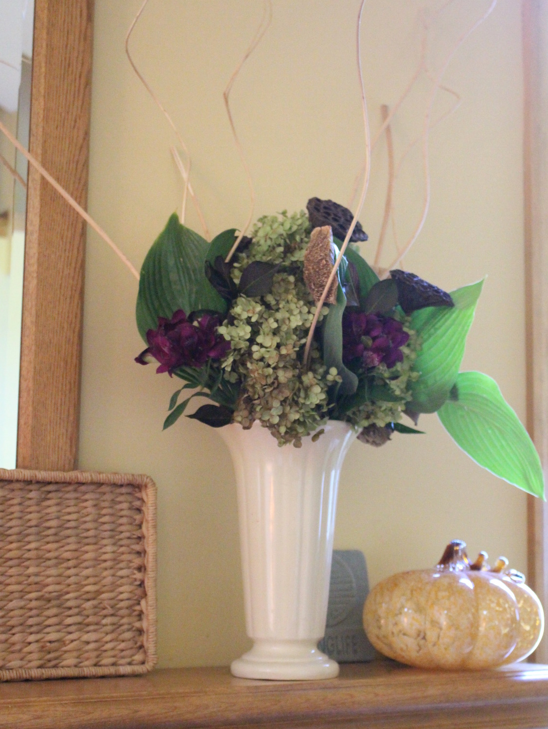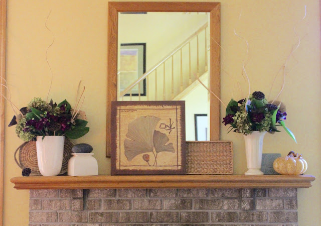 Here are the table decorations just tucked into the vases on the mantel along with some leftover green Hydrangea and the seed pods and curly sticks that have been in those vases all summer!