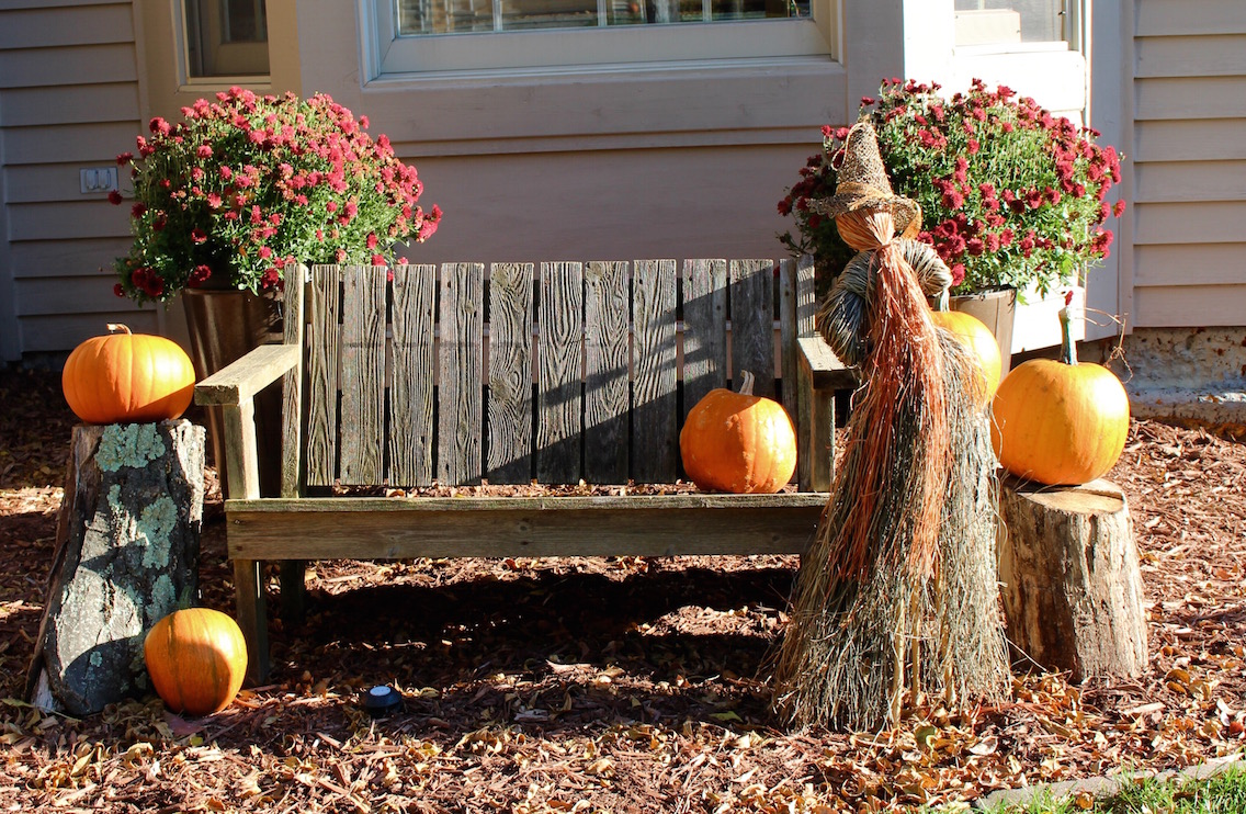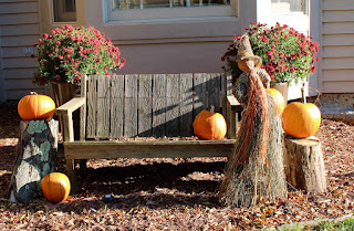 I was actually looking for stumps to use as pumpkin stands for the front yard….those were in the wood pile that is waiting to come home to warm our hearth! The old bench from the backyard moved center stage under the bay window. We still haven’t decided what plantings to do there….so this is a nice temporary fix.