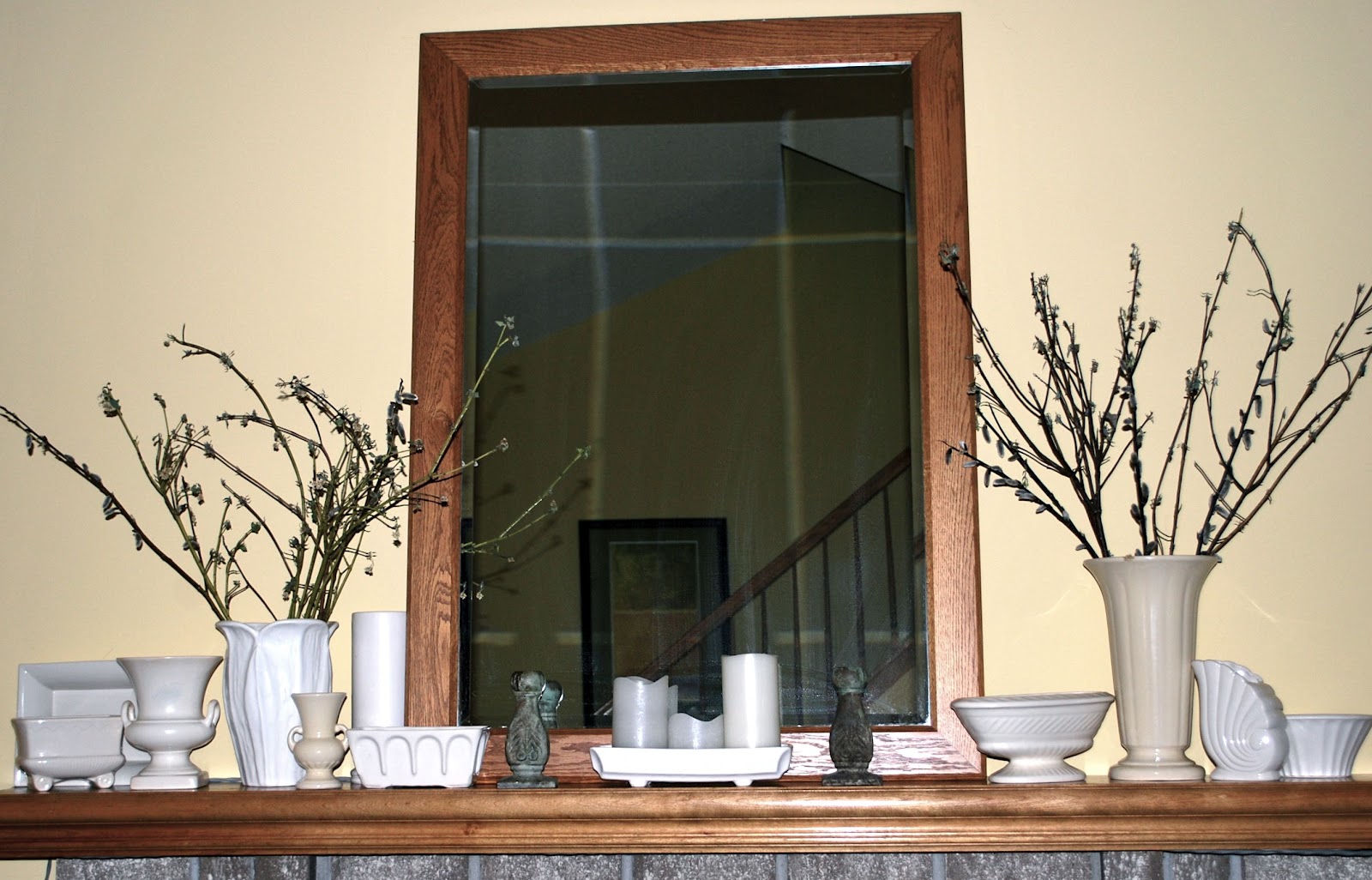 - My collection of off-white mid-century pottery is growing, thanks to thrift stores. These pieces are very versatile and they work for any season or holiday. If you have spent any time reading this blog….you probably notice that I use these all the time. Right now…I am using a selection for the mantel in the family room….simple!