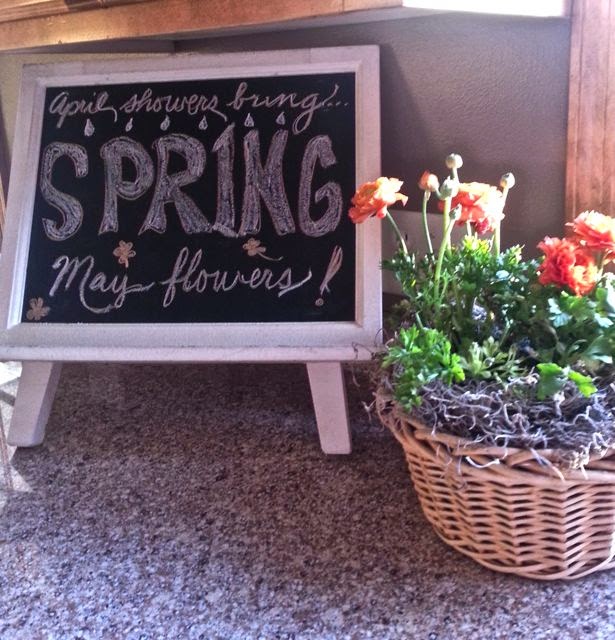 This looks so springlike and cheerful on the counter next to the chalkboard easel!