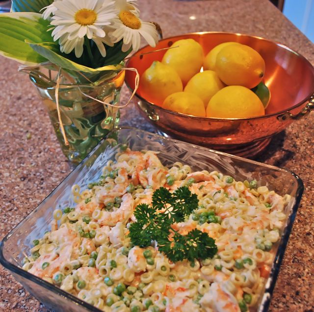 Just by adding some pasta and frozen peas…..you can double or even triple the size of the salad without losing any of the yummy goodness of the shrimp!