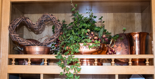 When I scored this small grapevine wreath at the thrift store….I knew it would be a perfect minimalist addition to the copper collection over the kitchen desk.
