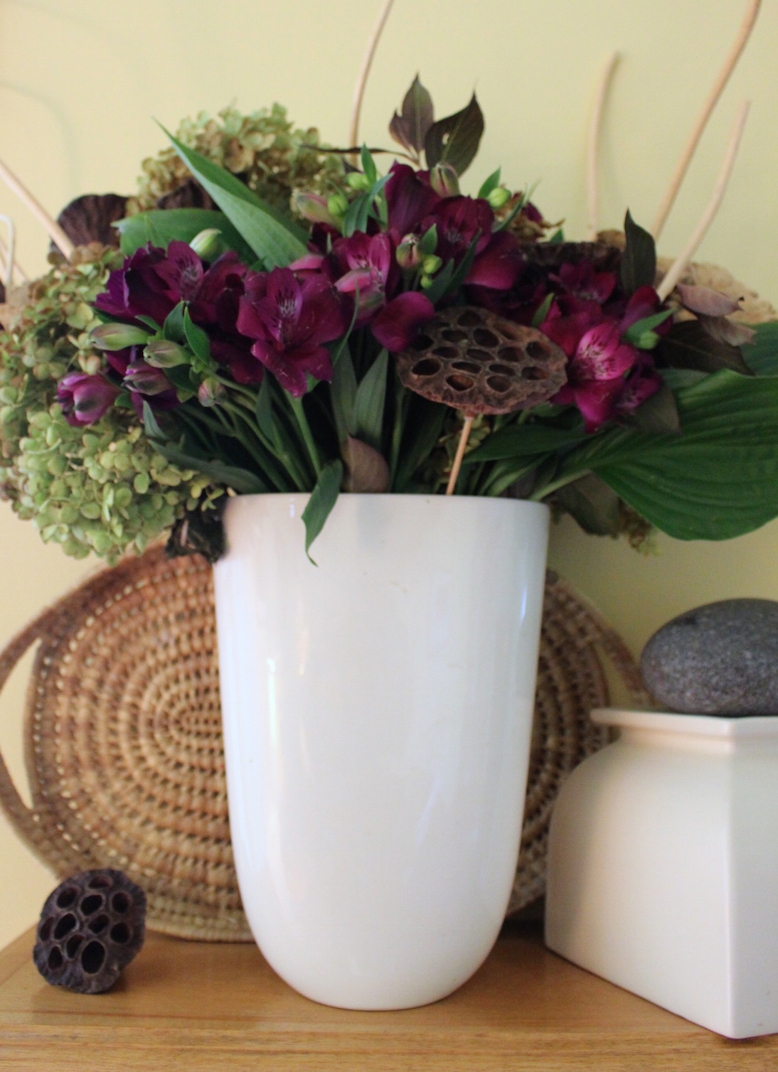 Here are the table decorations just tucked into the vases on the mantel along with some leftover green Hydrangea and the seed pods and curly sticks that have been in those vases all summer!